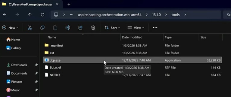 Повторение эксперимента на macOS приводит к тому же результату. Хотя версия Aspire там немного старее, тот же бинарный файл DCP появляется в папке пакетов.