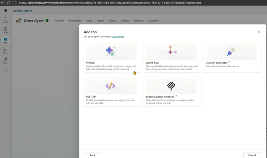 Чтобы добавить новый инструмент, нажмите Add a tool (Добавить инструмент) — появятся варианты инструментов: Prompt, REST API, Agent Flow, MCP и Custom Connector.
