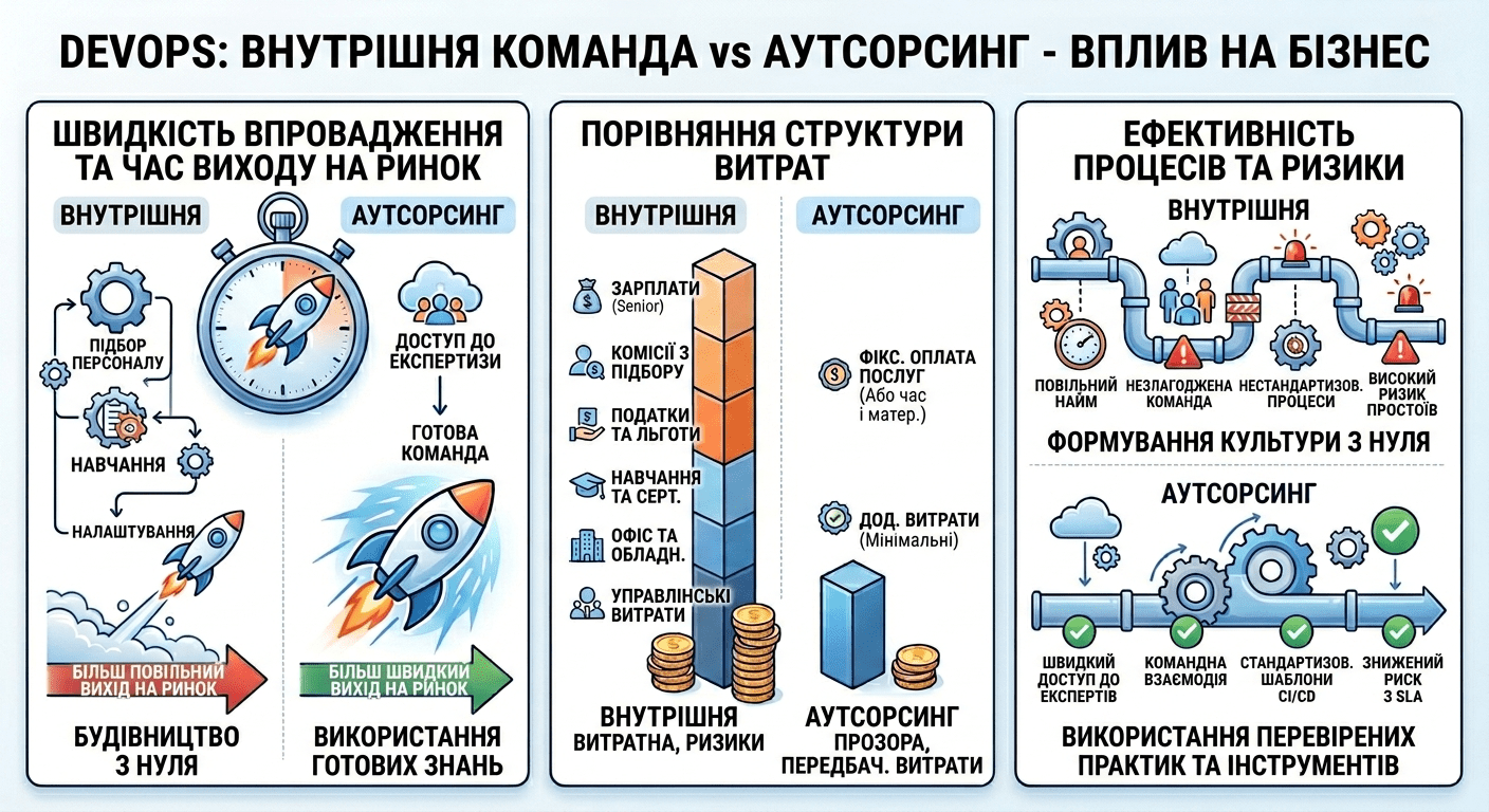Зібрати DevOps-команду — це місяці. Аутсорс можна підключити за 1–2 тижні.