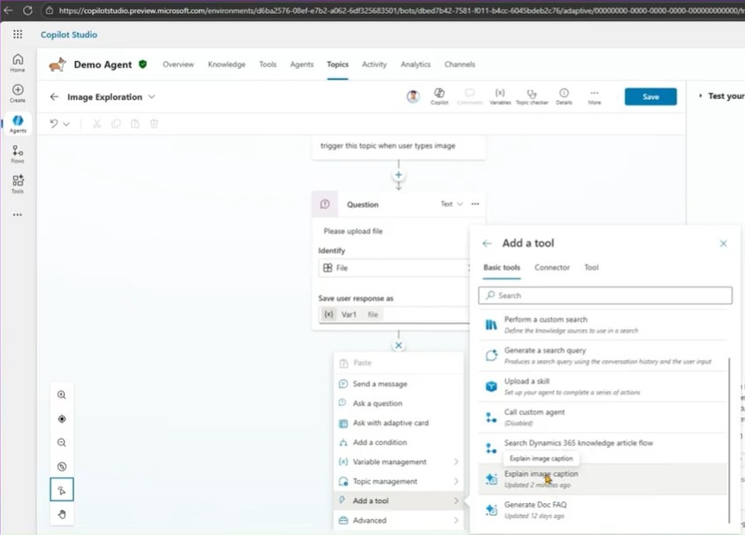Перейдіть у Agents → Demo Agent → Tools, і ви побачите ваш Prompt (наприклад, Explain Image Caption) серед доступних.